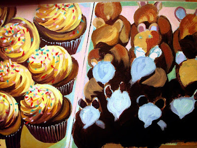 I loosened up yesterday. Simply coloring in those forms was driving me bats--another disgusting rodent. It took me the longest time rolling around on my chair, mixing up a new batch of dark chocolate colored paint, spinning for twenty minutes then lifting free weights before I decided the hell with this apprehension. I mixed up some colors and began dabbing away. In the next few days I'll probably mess up the creatures some more then bring them back. That is how I've painted my whole life--the only thing I have to be careful about is screwing up the surface. The cupcakes on either side are not done impasto. The mice can't be impasto either.